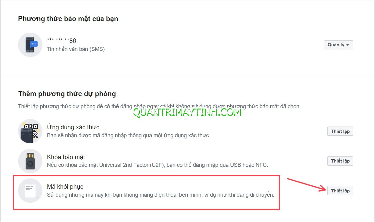 - Để đề phòng trường hợp bạn bị mất điện thoại, hỏng sim mà chưa kịp khôi phục nhưng muốn truy cập Facebook thì hãy sử dụng tính năng mã khôi phục trong phần Thêm phương thức dự phòng.