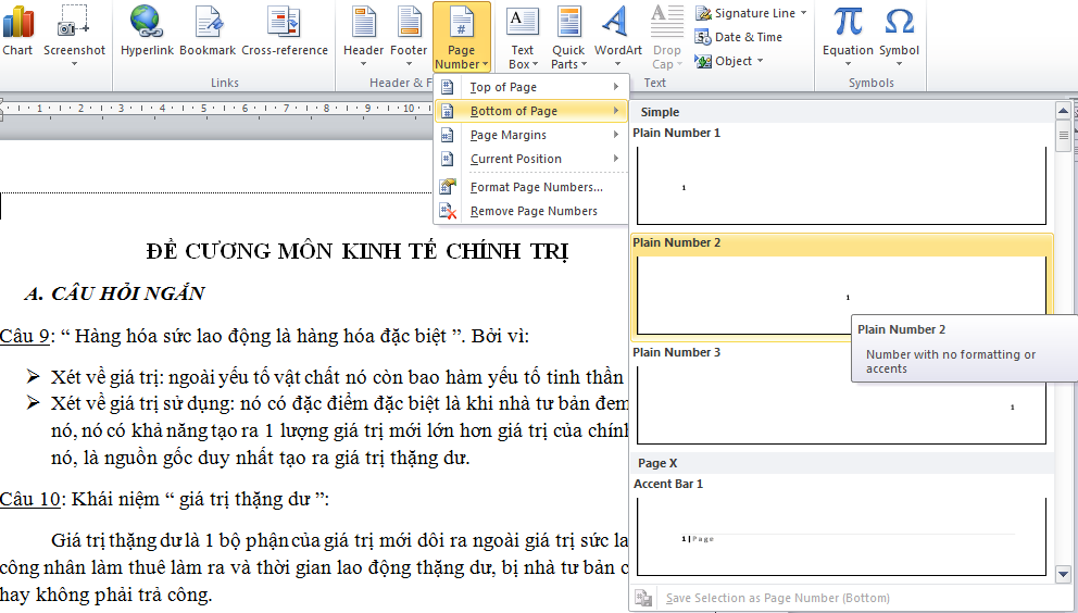Bước 2: Bạn chọn Page number rồi chọn vị trí đánh số trang. Thông thường người dùng sẽ chọn đánh ở giữa phần chân trang. (chọn bottom of page rồi chọn Plain Number 2)
