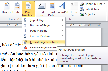 Bước 1: Bạn chọn thẻ Insert, chọn Page Numbers rồi chọn Format Page Numbers