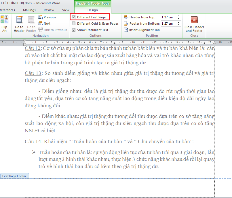 Bước 3: Bạn có thể xóa số ở trang 1 đi theo cách thủ công (Backspace) hoặc đánh dấu tích vào ô Different First Page