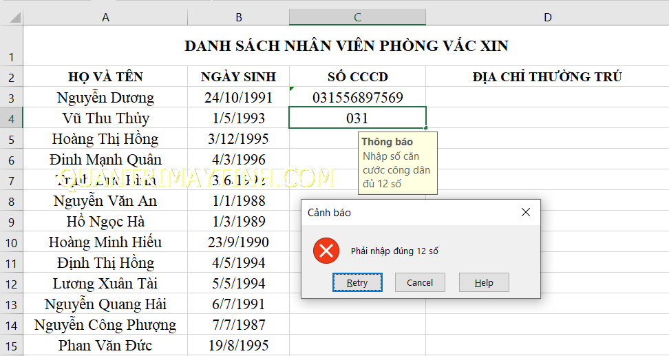 Giả sử mình phải nhập 01 danh sách nhân viên như hình dưới. Nhiệm vụ bây giờ phải nhập số căn cước công dân của các nhân viên. Vậy mình sẽ giới hạn số CCCD phải đúng đủ 12 số, không ít hơn và không nhiều hơn 12 số.
