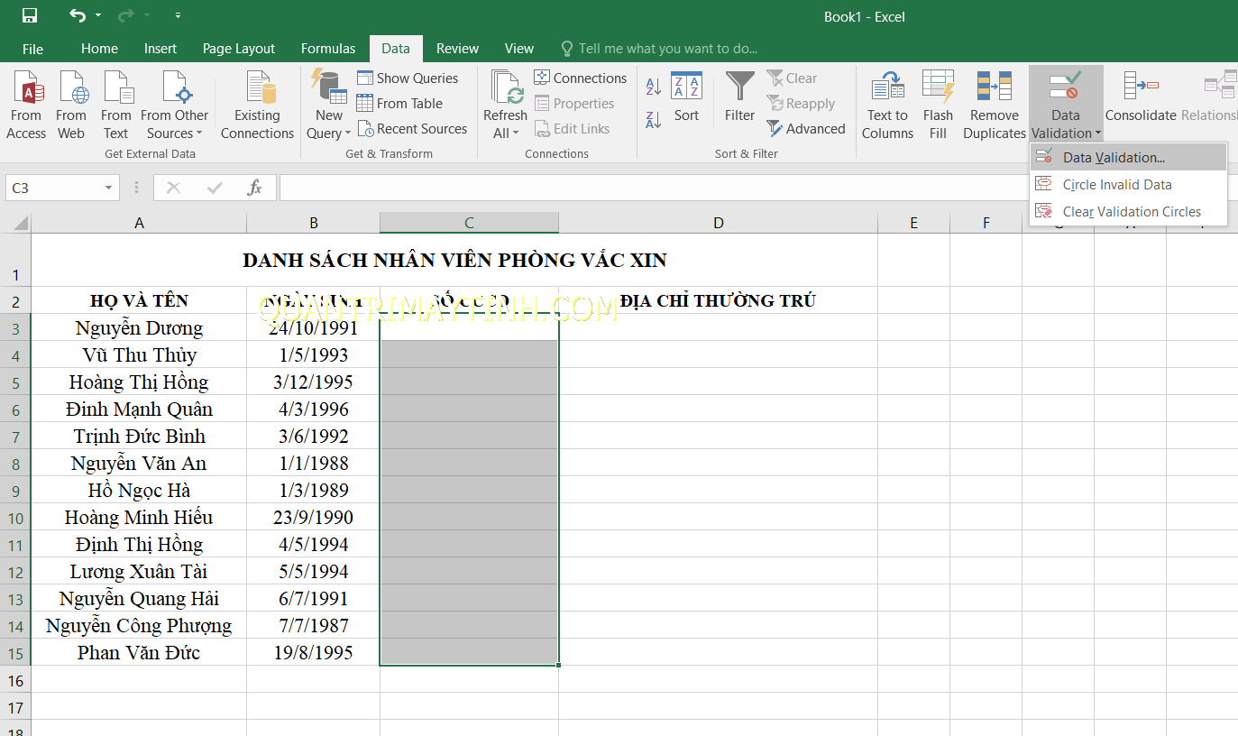 Bước 1: Bạn bôi đen cột số căn cước công dân, chọn thẻ Data rồi chọn Data Validation