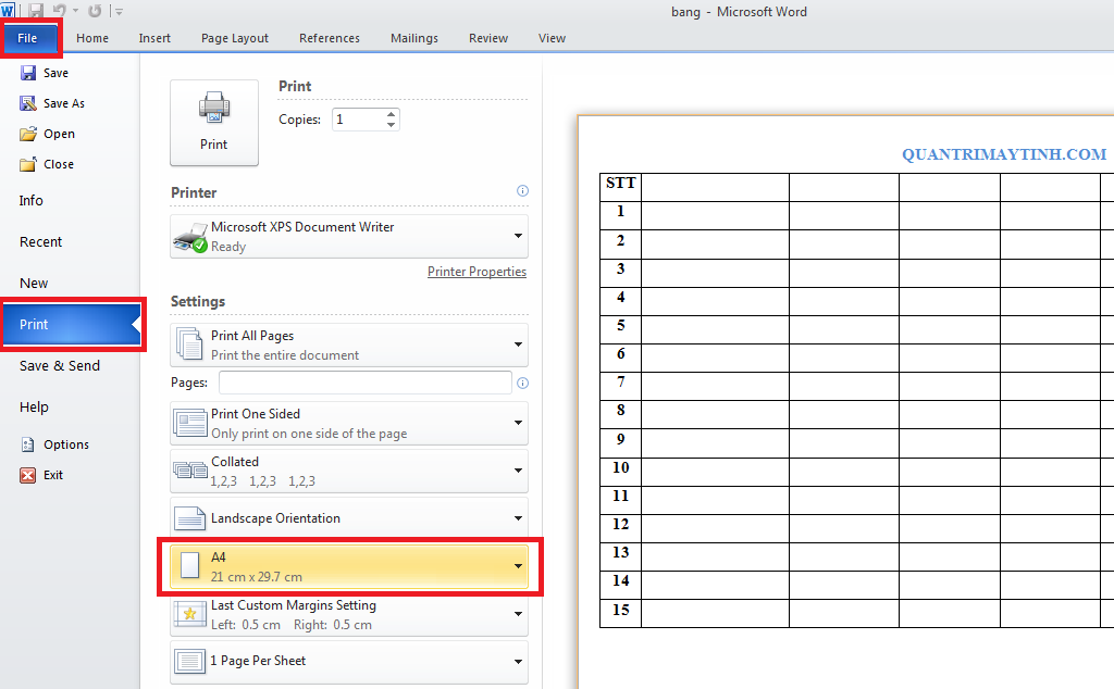 Bạn chọn thẻ File rồi chọn mục Print (hoặc bấm Ctrl + P), nhìn vào phần khổ giấy, nếu nó không phải A4 thì bạn chuyển về khổ A4