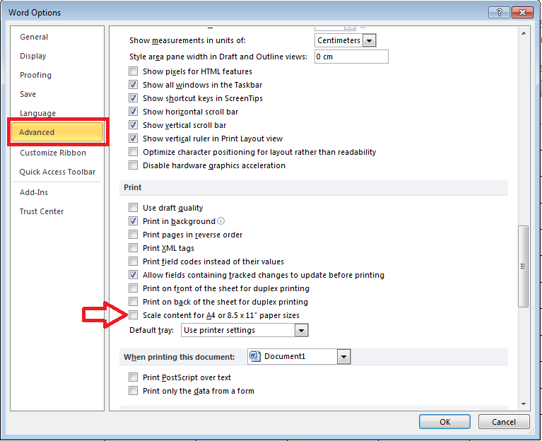 Kéo thanh trượt xuống phần Print, bạn bỏ dấu tích ở ô Scale content for A4 or 8.5 x 11" paper sizes đi