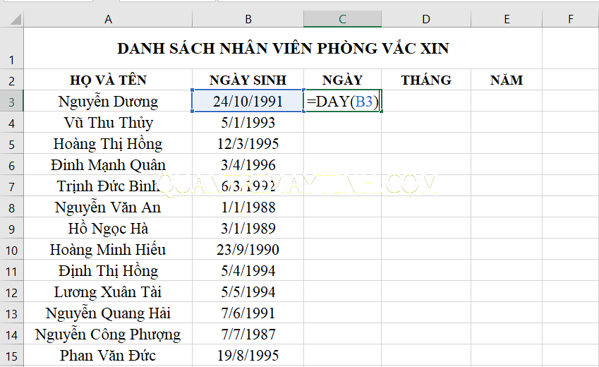 Bước 1: Bạn đặt con trỏ vào ô C3, gõ công thức sau =DAY(B3) rồi bấm Enter. Sau đó, bạn copy công thức xuống các dòng tiếp theo.