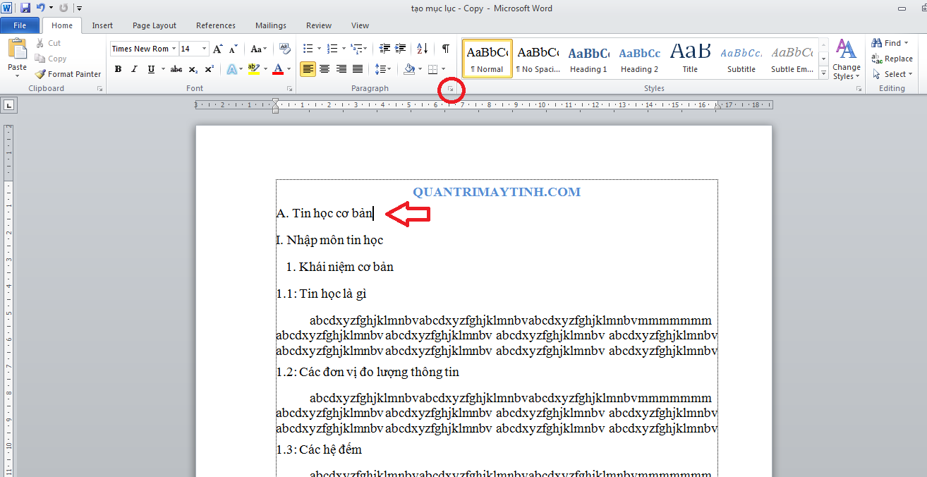 Bước 1: Bạn đặt con trỏ đến dòng cần tạo mục lục rồi bấm mở hộp thoại Paragraph ra