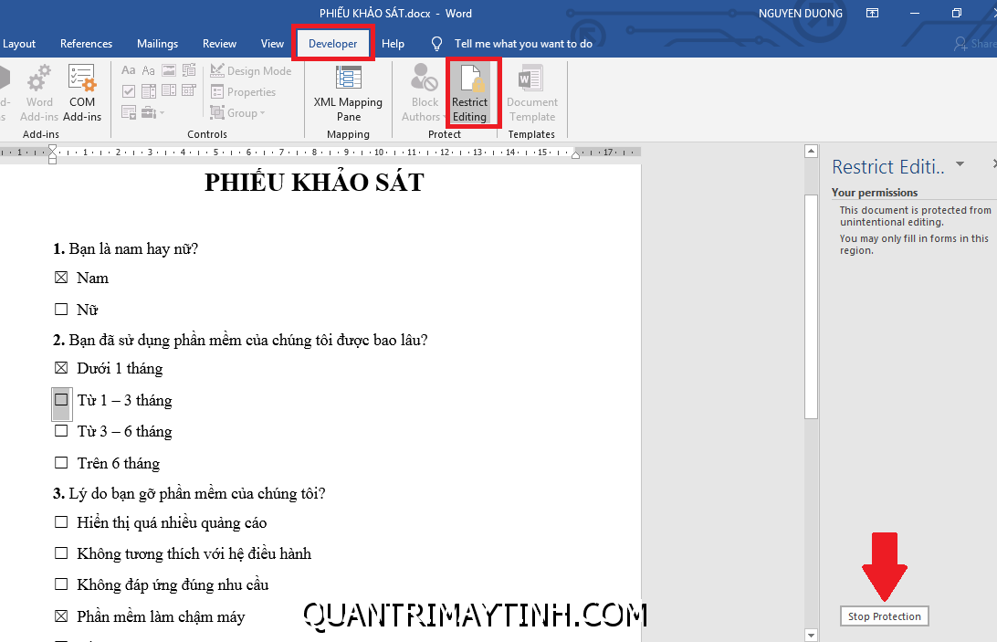 Bước 1: Trong thẻ Developer, bạn chọn Restrict Editing, click nút Stop Protection ở cột bên phải