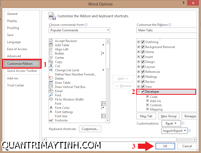 Bước 2: Trong hộp thoại Word Options, bạn chọn mục Customize Ribbon, đánh dấu tích vào ô Developer rồi chọn OK. Thao tác này làm để đưa thẻ (tab) Developer ra màn hình