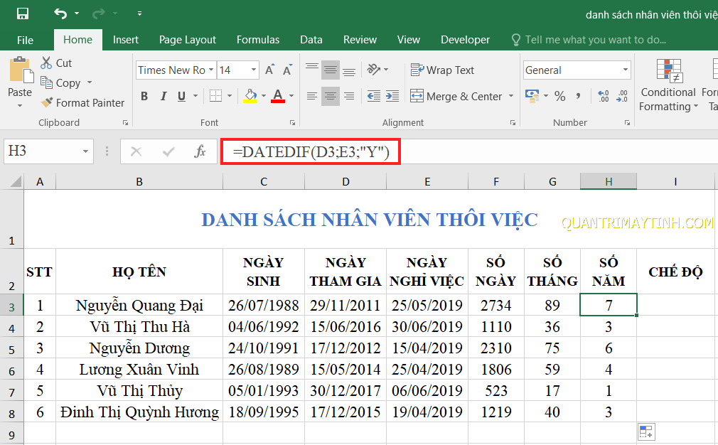 - Đối với cột SỐ NĂM thì bạn nhập công thức như sau: =DATEDIF(D3;E3;"Y")