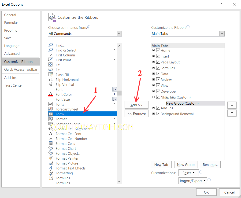Bước 4: Trong cột Choose commands from, bạn tìm chọn công cụ Form rồi click chọn Add.