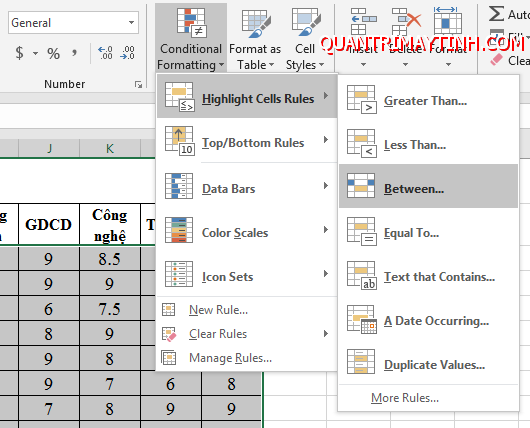 Bước 1: Chọn thẻ Home rồi chọn Conditional Formatting => Hightlight Cells Rules => Between